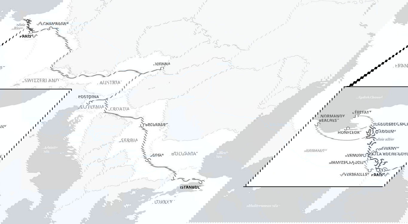 Disembark the S.S. Joie de Vivre and transfer to the Paris Gare de Lyon Station, where the indulgence begins with a champagne drinks reception before stepping aboard the stylish Golden Eagle Danube Express. Settle into life onboard your private train as we journey across the serene French countryside towards our first stop, Champagne. Renowned for producing the world's finest sparkling wines, Champagne boasts manicured vineyards draped over rolling hills. On an exclusive guided tour of one such vineyard today, you'll enjoy a tasting of this AOC-protected product. (B)