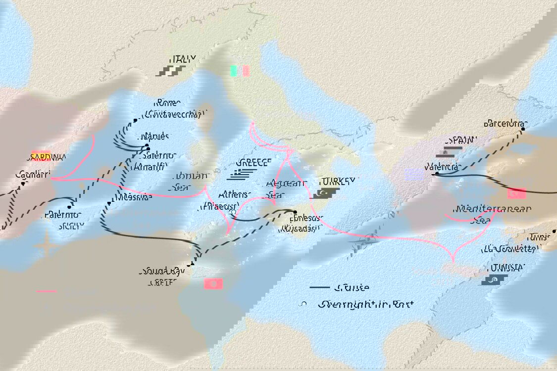 Souda Bay enjoys a picturesque setting between Crete's Akrotiri Peninsula and Cape Drapano. Historic fortifications, vestiges from the island's days under the Venetian Empire, greet ships at the mouth of the long bay, one of the deepest natural harbors in the Mediterranean. Crete is said to have been home to Europe's earliest civilization—the Minoan civilization. The legendary Palace of Knossos was the royal residence at its center; its ruins were first discovered during the late 19th century and excavation took more than 35 years.