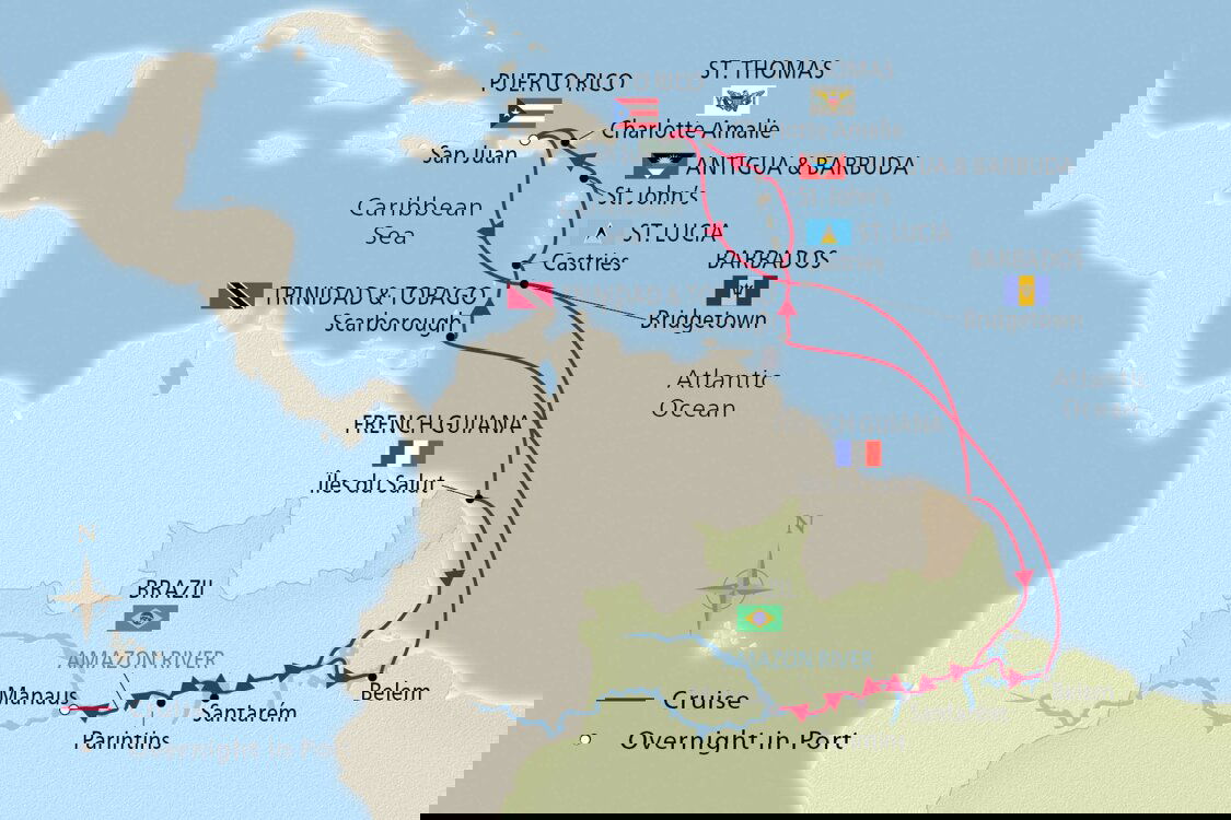 Set sail into the mouth of the mighty Amazon River. The Amazon is largest river in the world by volume and feeds its famed rainforest, know as “the lungs of the world.”