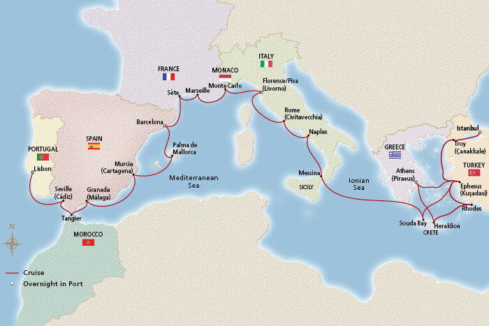 Souda Bay enjoys a picturesque setting between Crete's Akrotiri Peninsula and Cape Drapano. Historic fortifications, vestiges from the island's days under the Venetian Empire, greet ships at the mouth of the long bay, one of the deepest natural harbors in the Mediterranean. Crete is said to have been home to Europe's earliest civilization—the Minoan civilization. The legendary Palace of Knossos was the royal residence at its center; its ruins were first discovered during the late 19th century and excavation took more than 35 years.