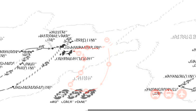 Transfer to the airport and fly to Dalanzadgad, the gateway to the Gobi Desert. Begin your sightseeing in a comfortable, air-conditioned 4WD with a visit to a local market, then drive to the Yol Valley in the Gobi Gurvansaikhan National Park. Take a scenic walk through a narrow gorge surrounded by towering rock formations. Spend the night in a premium ger camp. (B/L/D)