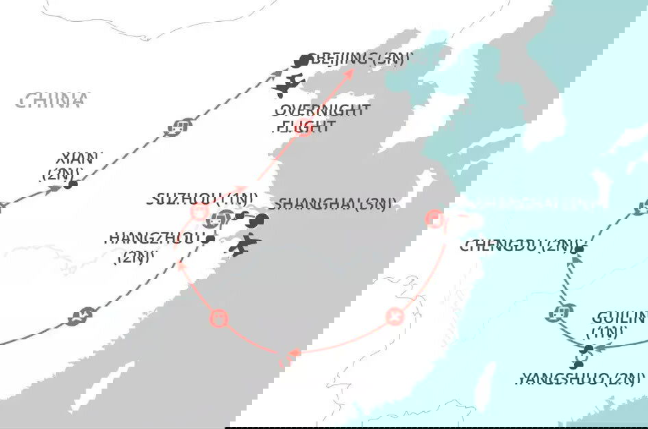 Travel to the water town of Wuzhen, known for its timber buildings and narrow canals. Enjoy a Chinese wine tasting experience before continuing to the garden city Hangzhou. (B/L/D)